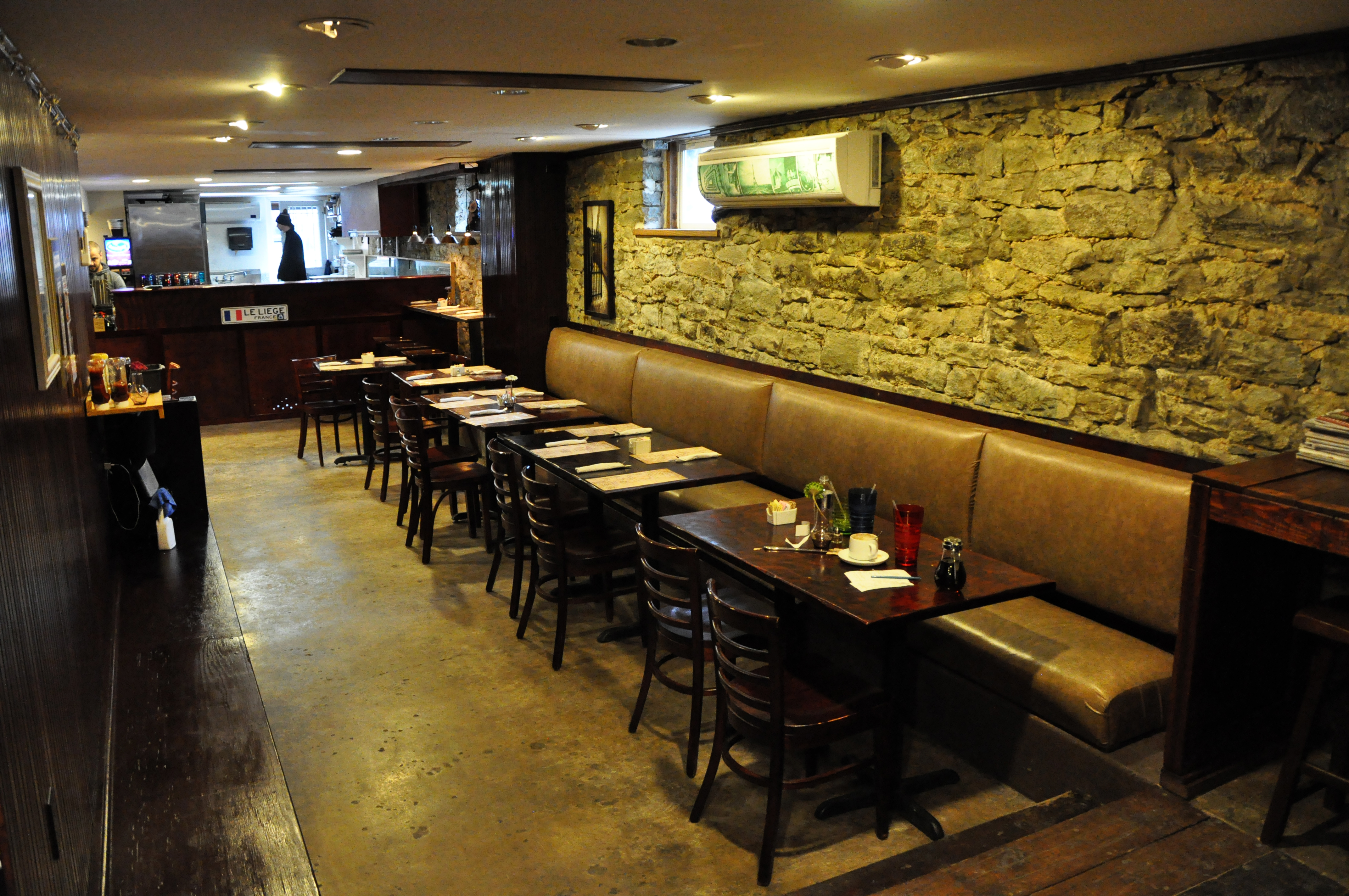 Something about being underground surrounded by natural stone walls just takes the ambiance to a whole new level. The low ceilings and soft lighting create a crêpe munching den that is comfortable and welcoming. There is even another step down after the bar-style seating which separates the space nicely. Where there isn’t stone, dark wooden paneling wraps around the room. All the colors are organic and earthy, and the thoughtful decor contributes to the restaurant’s charming character.