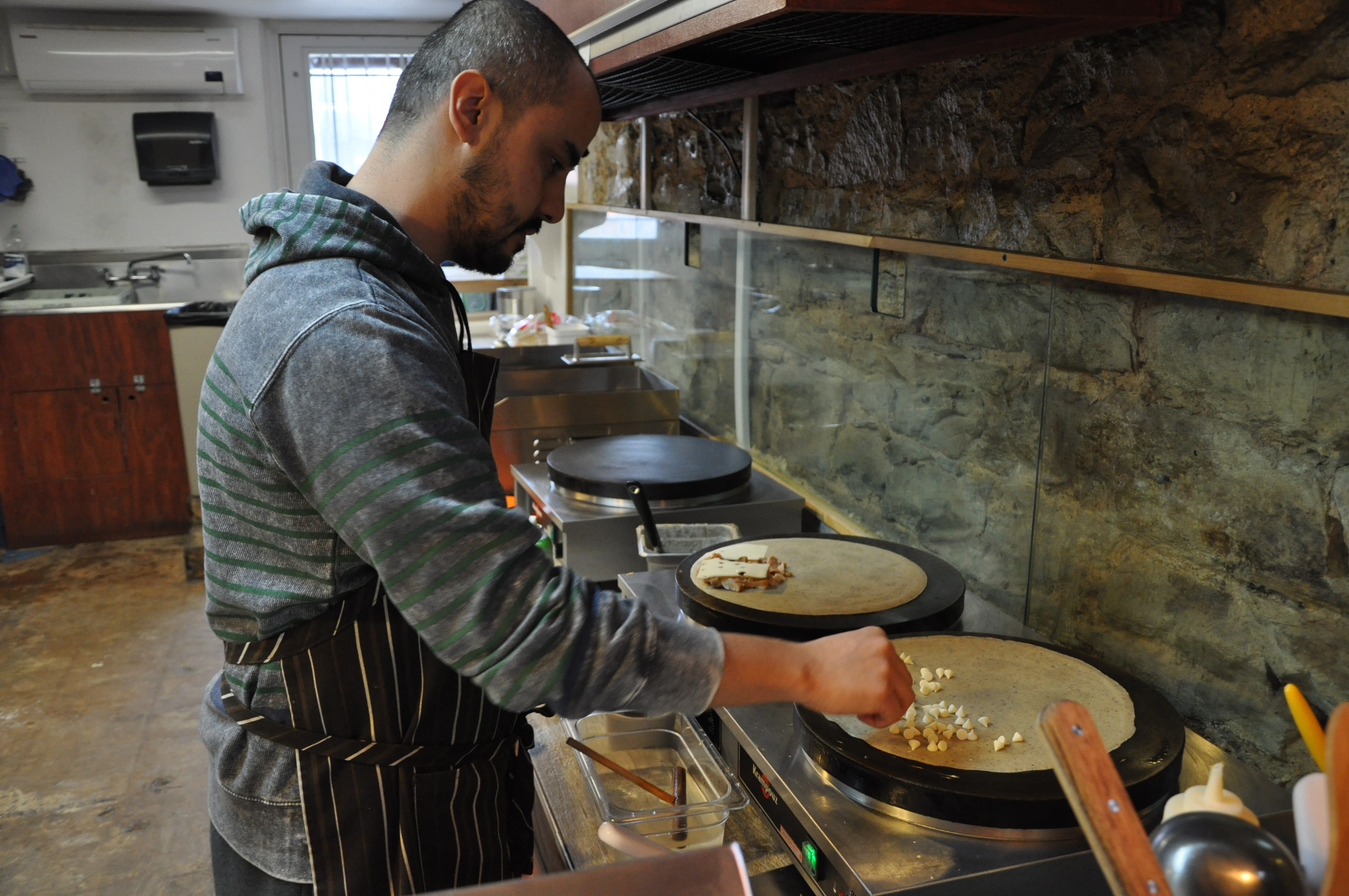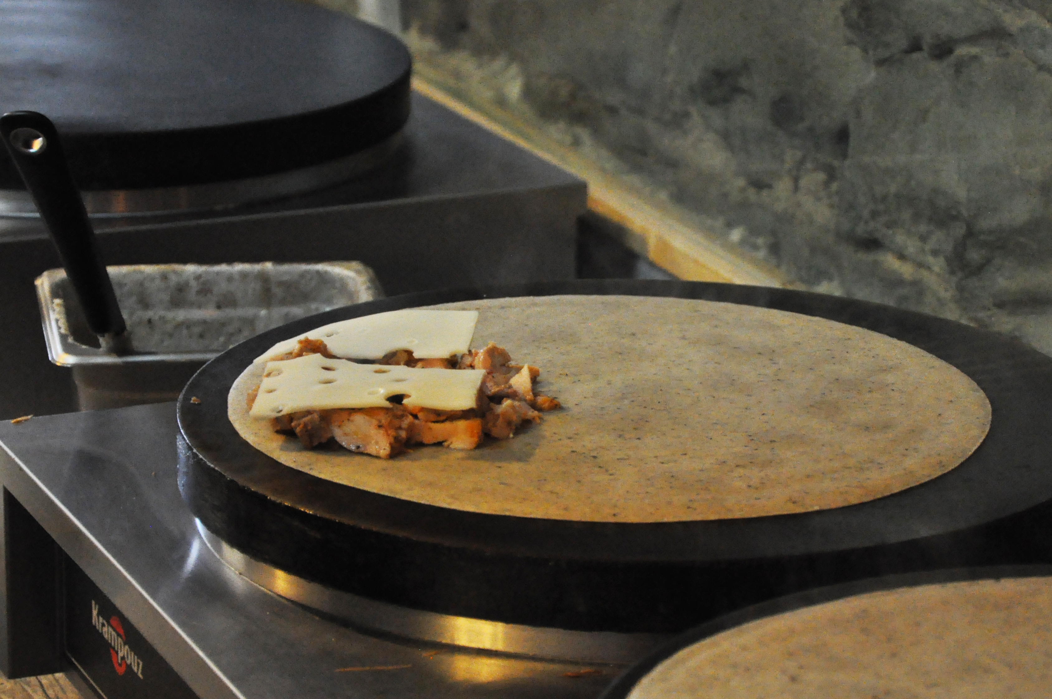 These are the big, bad, industrial crêpe makers that do not mess around. With an experienced chef behind them, the possibilities are endless. You can see him placing white chocolate chips that will slowly melt for a sweet crêpe. Behind it, slices of Swiss wait to conform to the chicken beneath. Have you ever seen crêpe batter spread that perfectly circular?! It reminds me of the Spongebob episode where Squidward can’t believe how Spongebob is sketching an immaculate circle in art class.