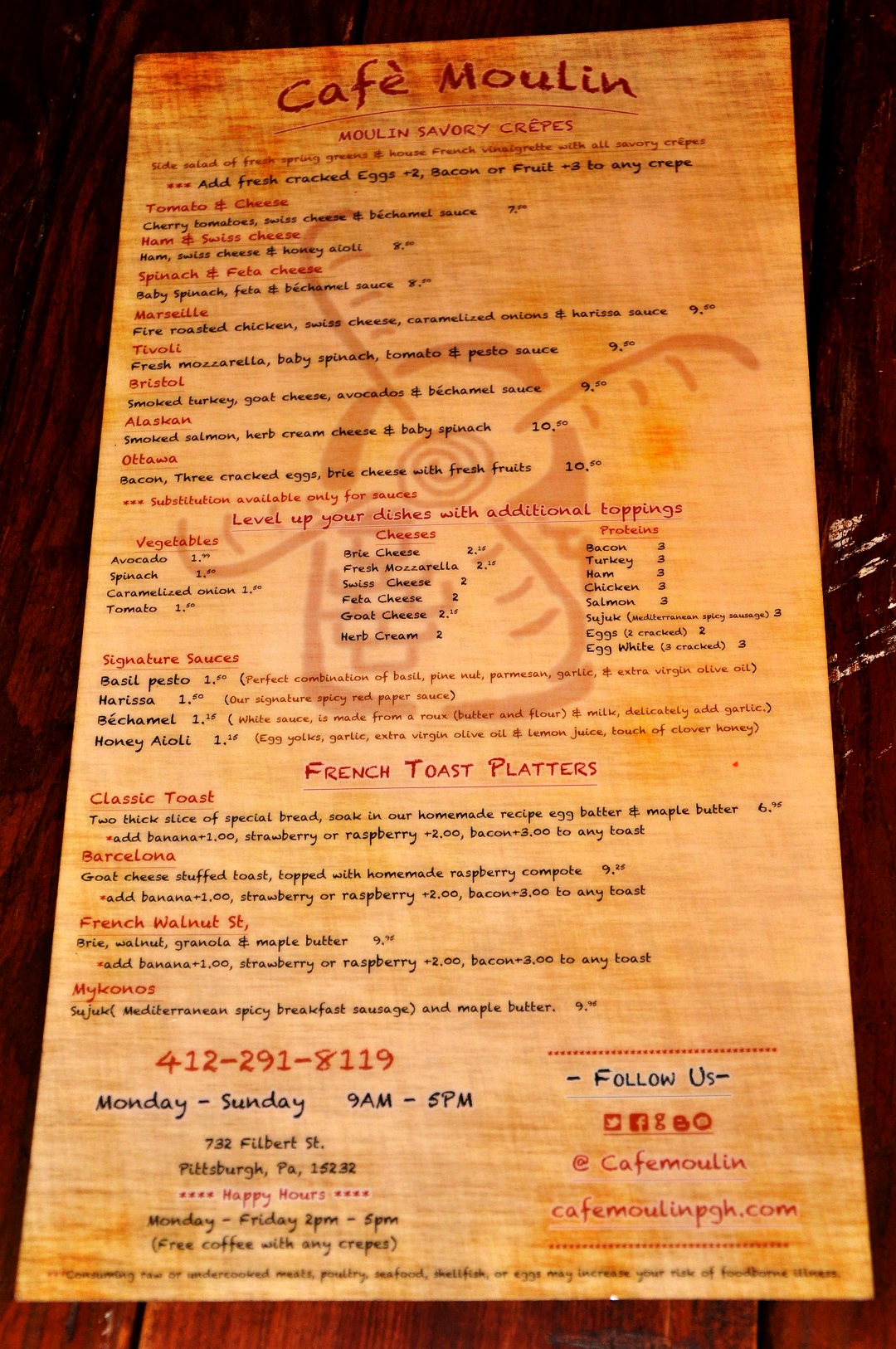 Crêpes Parisiennes was a quaint, underground French café in Shadyside tucked off the main drag that became our go-to spot. That is where I not only learned of crêpes, but fell in love with them. David Handler, once a fashion photographer in Paris, brought his old daily lunch ritual to this Pittsburgh location in September of 2000. In the fall of 2013, David moved his crêpery to a larger location on Craig Street in Oakland, and the subterranean den became available. The space was acquired by new owners, and was transformed into the new Café Moulin.