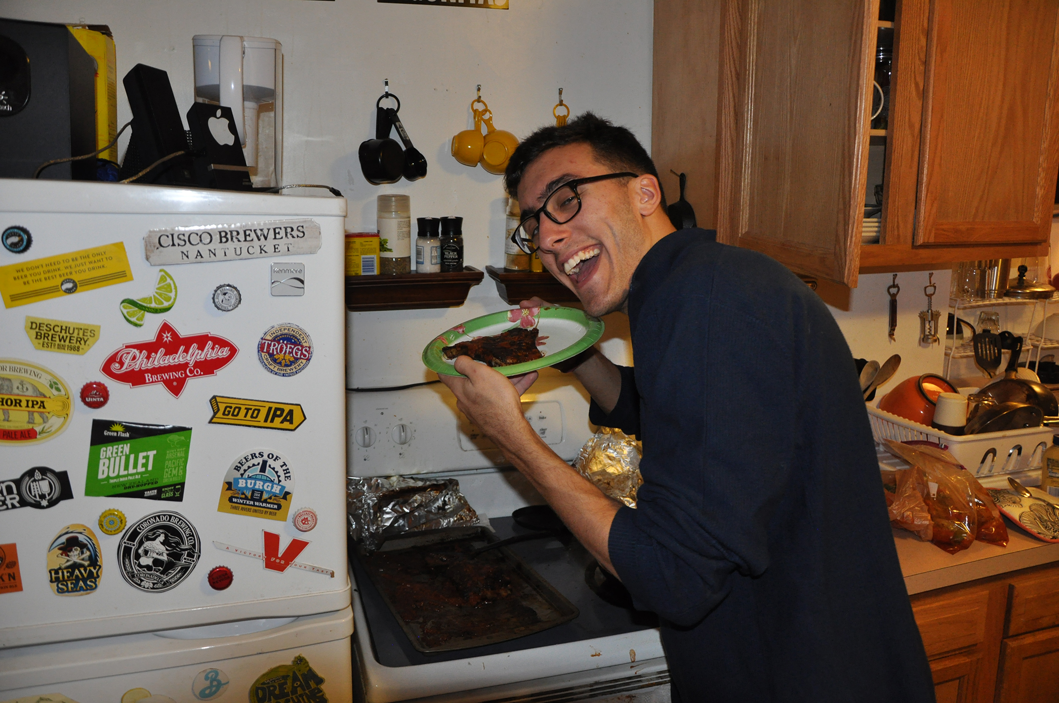 There is something indescribably gratifying about meat and football. We destroyed the ribs like Broncos defense destroyed Cam Newton. It’s always fun to have people over for some over-hyped TV event. It turns it into a truly memorable night though when you can accompany it with some stellar food. As evidence by my friend Saul’s euphoric expression, the evening was a huge success. The ribs were on point, spirits were high, the kitchen was a mess, friends were drunk, and football was entertaining. I may just have to make Super Bowl and ribs an annual tradition…